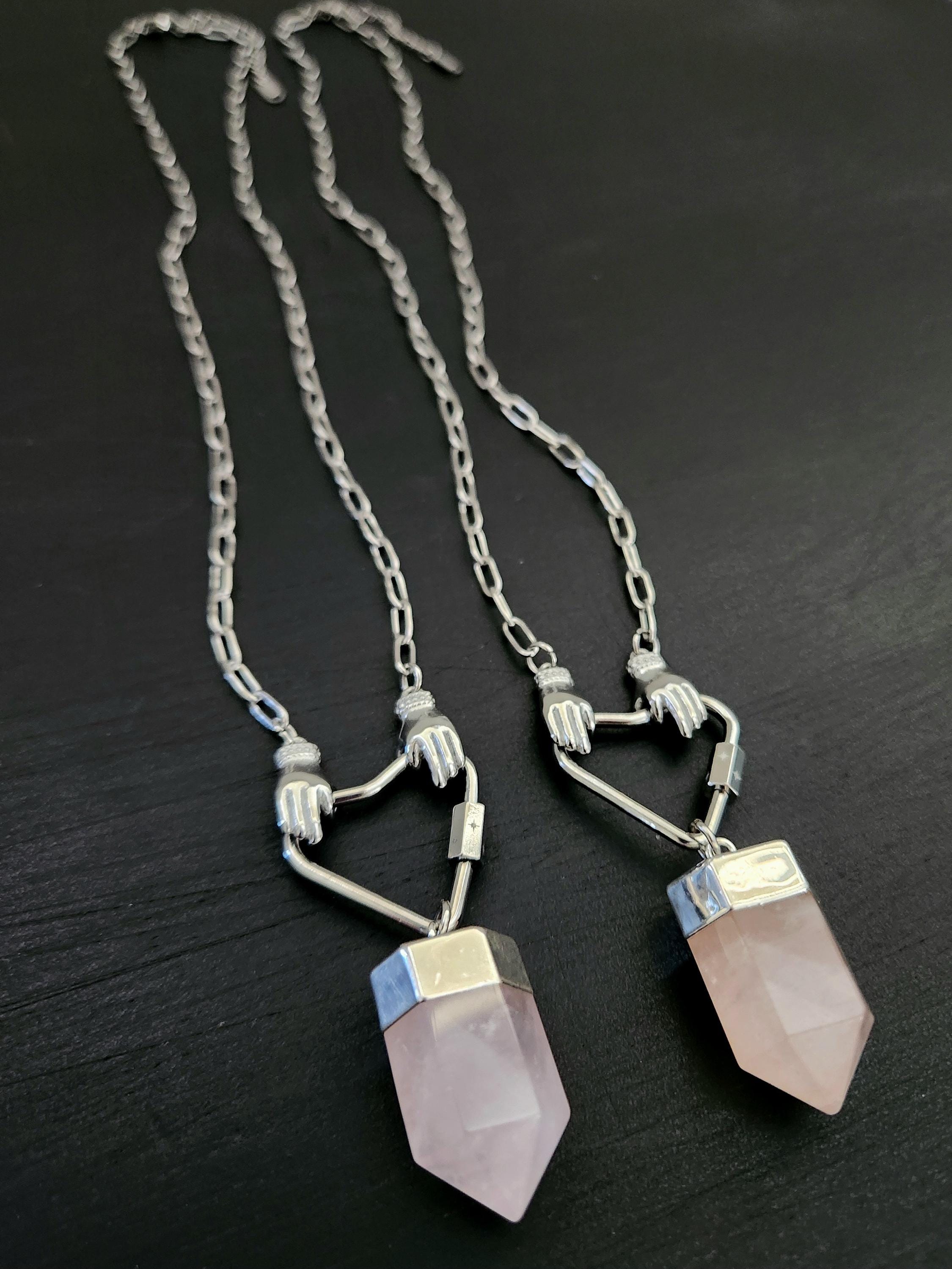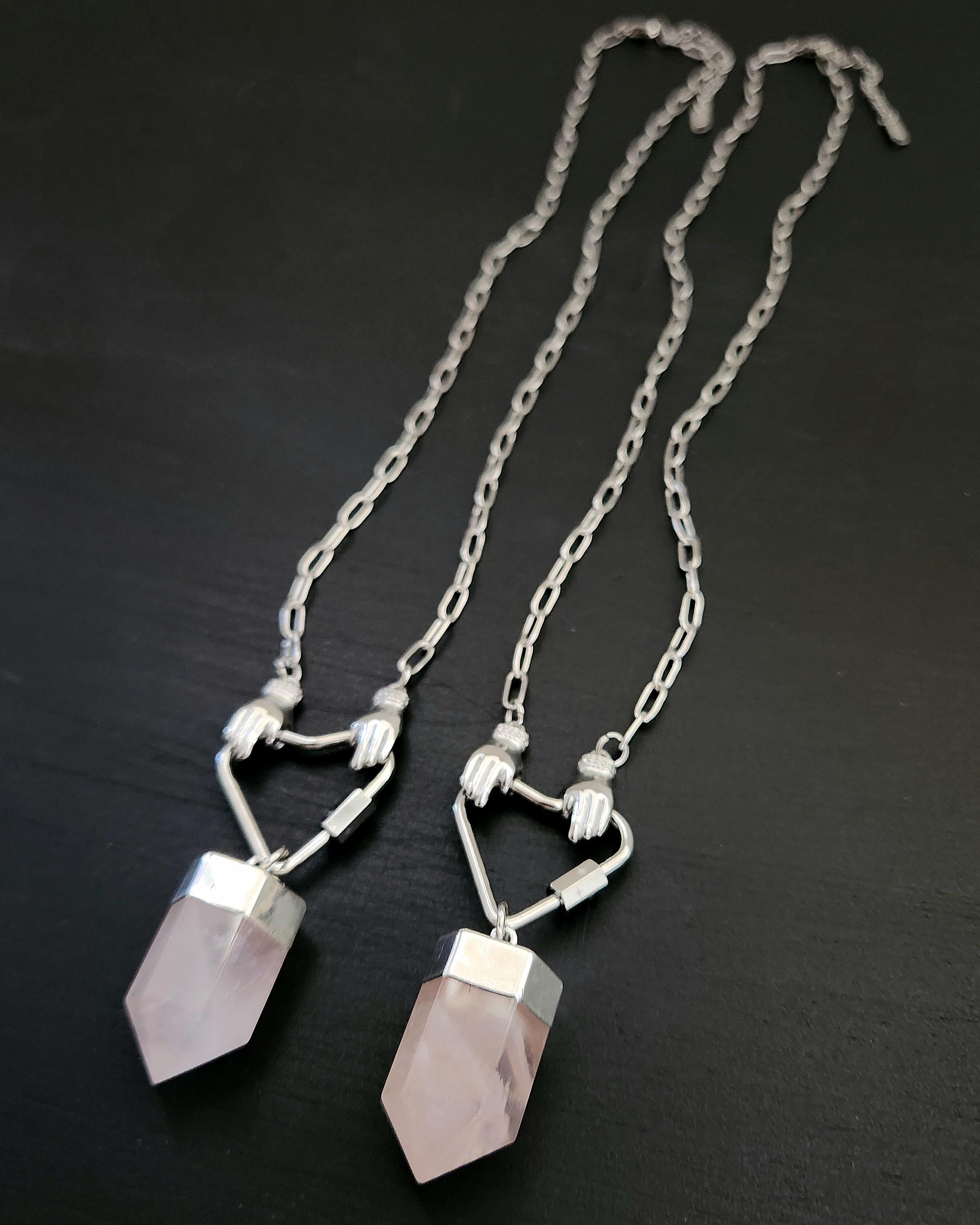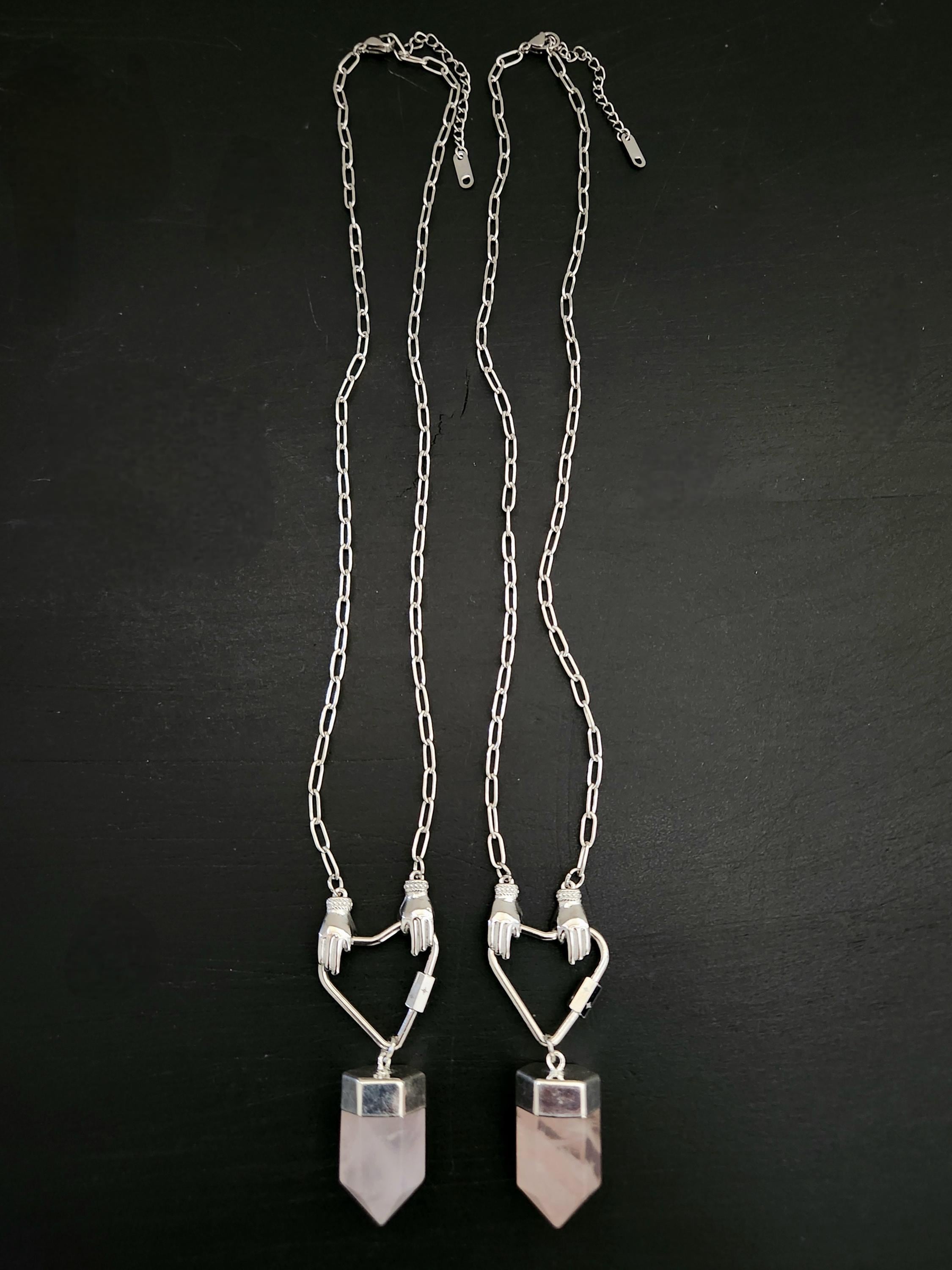 -Stainless steel hands holding heart w/ Rose Quartz point pendant, approx 2.5"