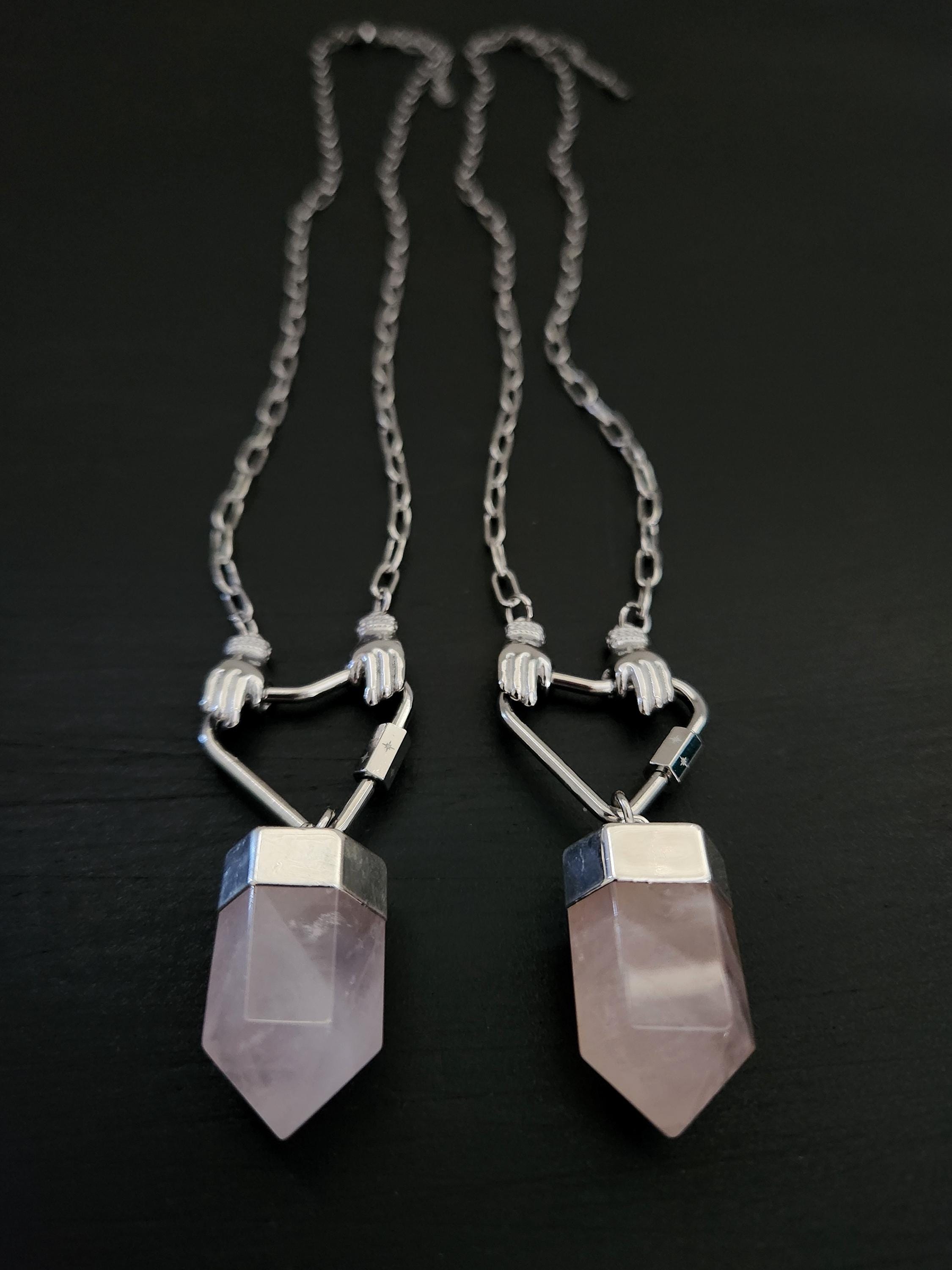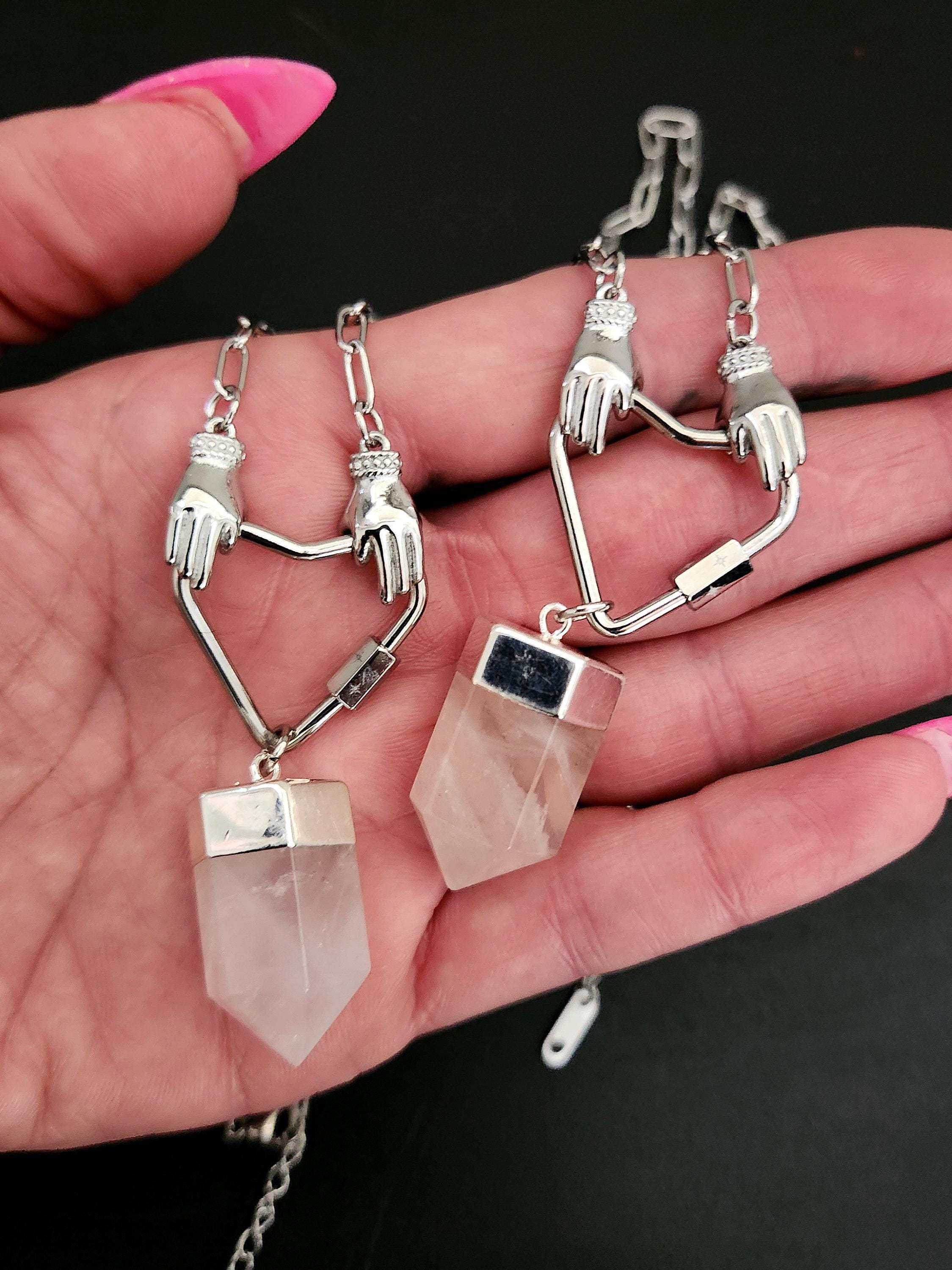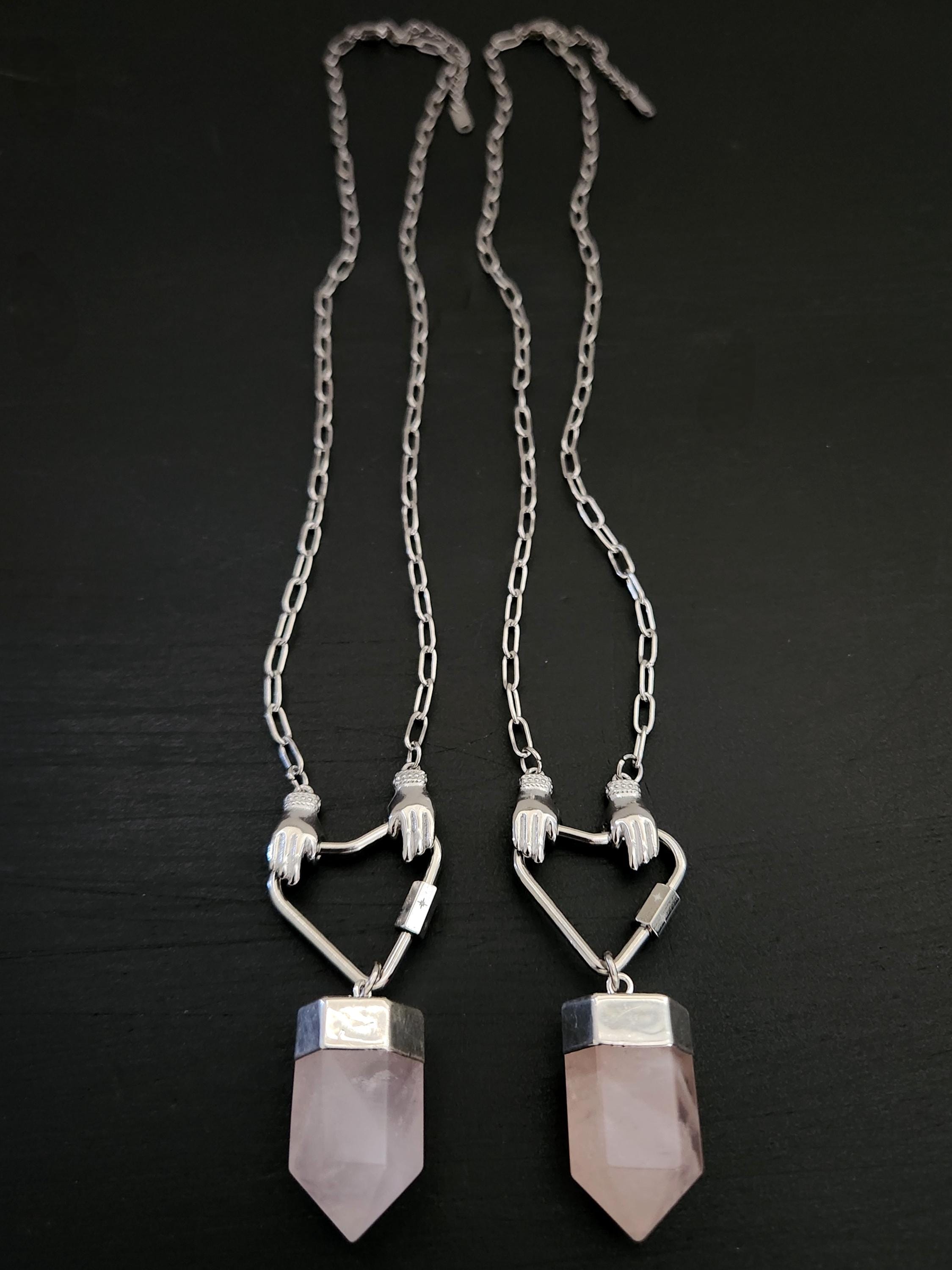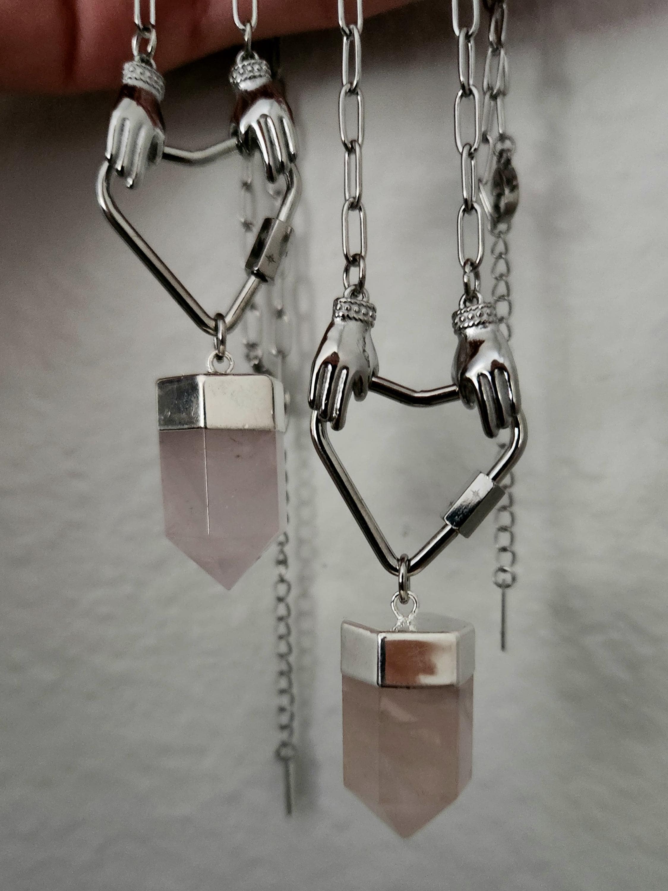 -Stainless steel hands holding heart w/ Rose Quartz point pendant, approx 2.5"