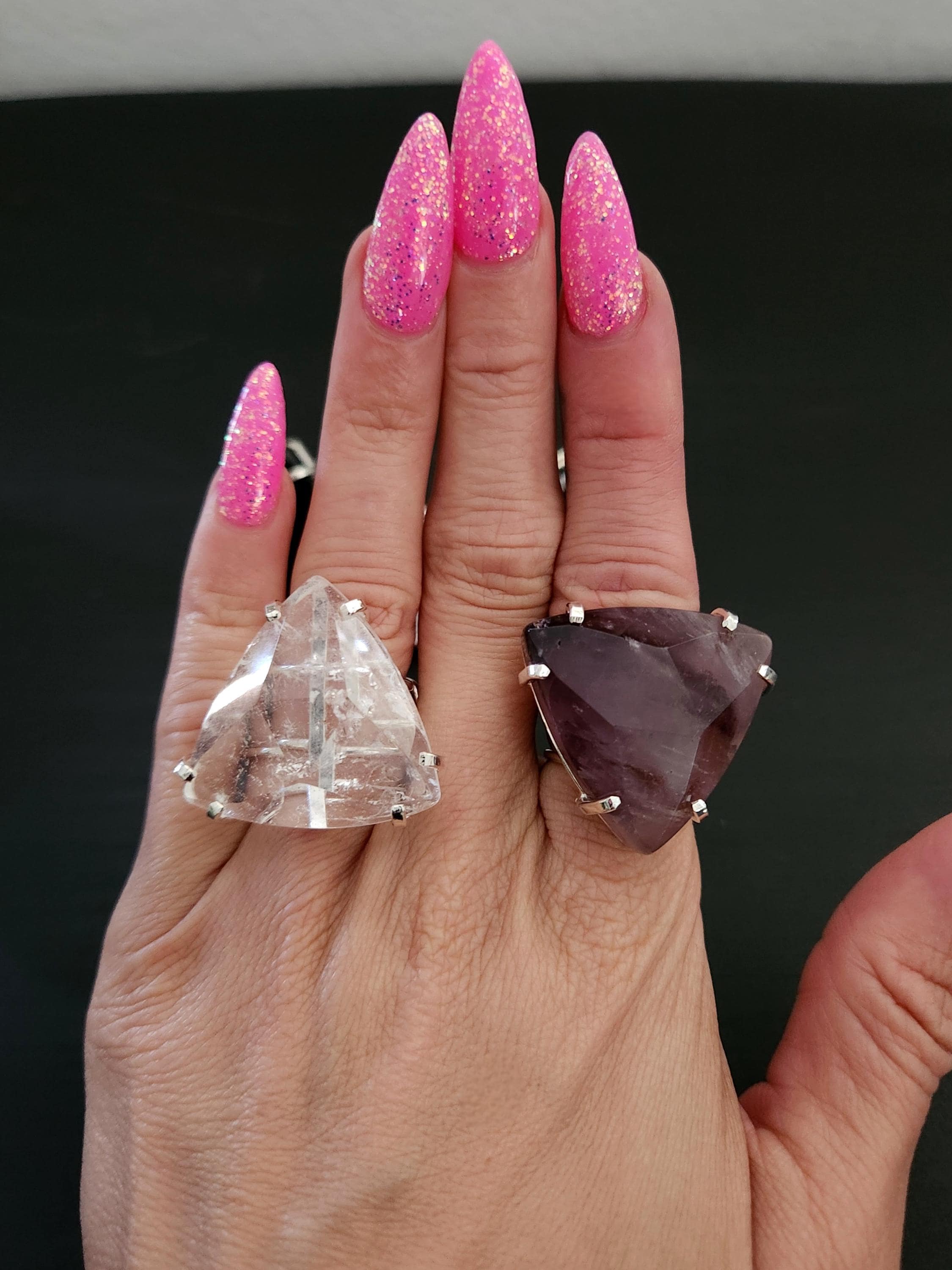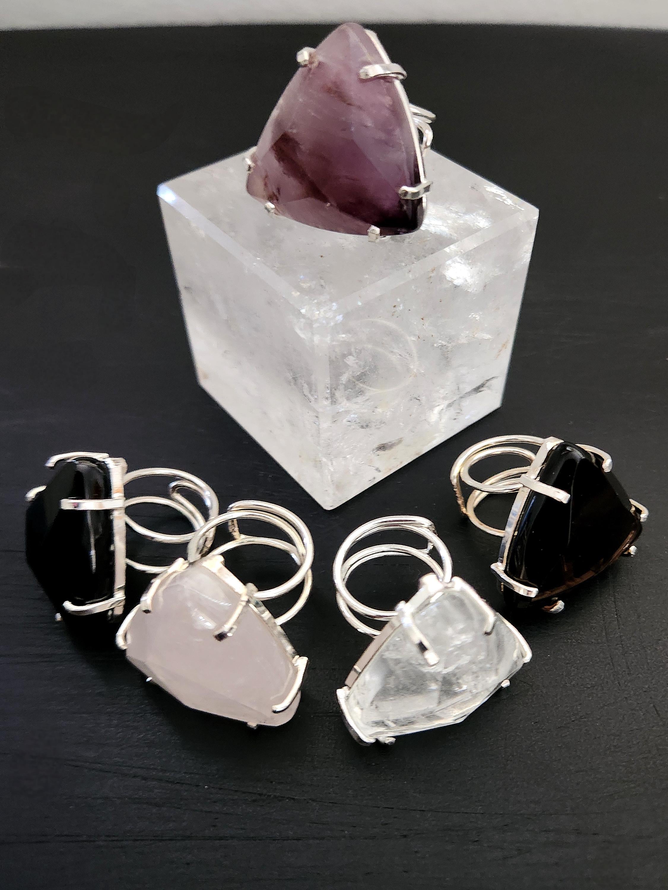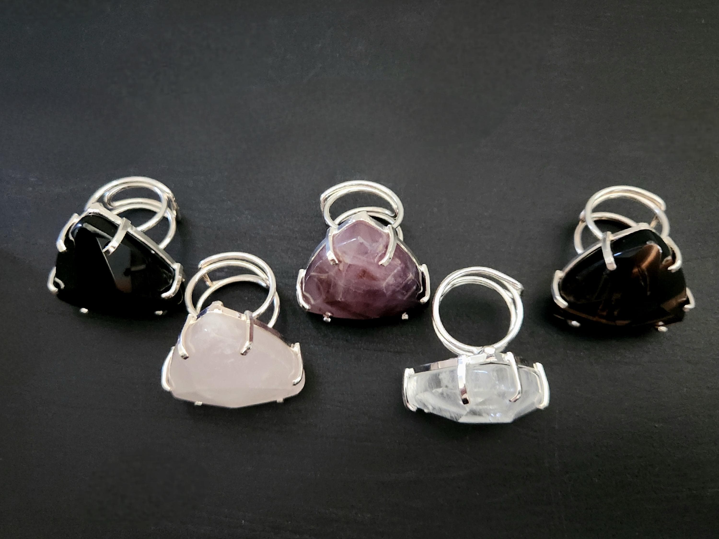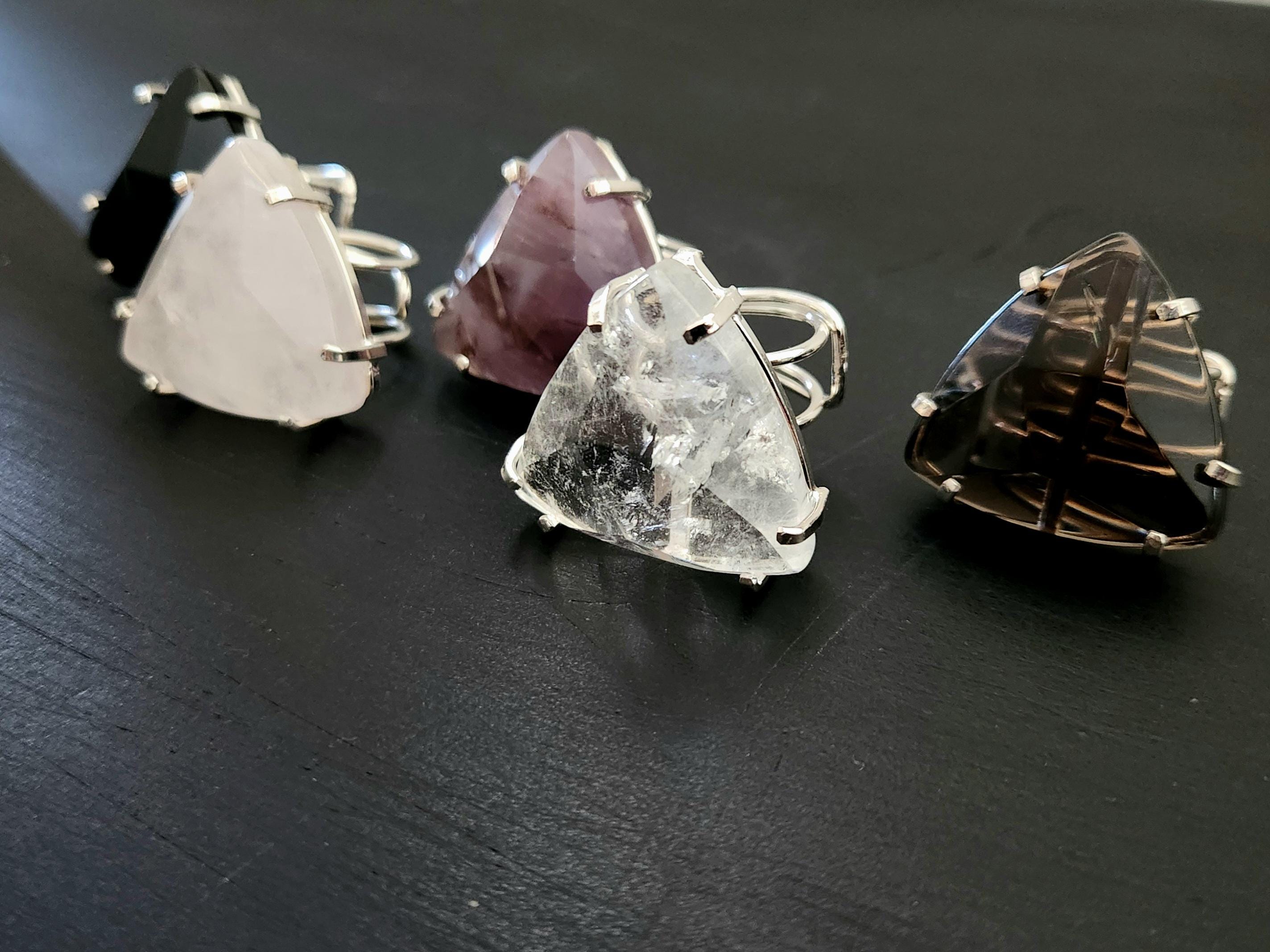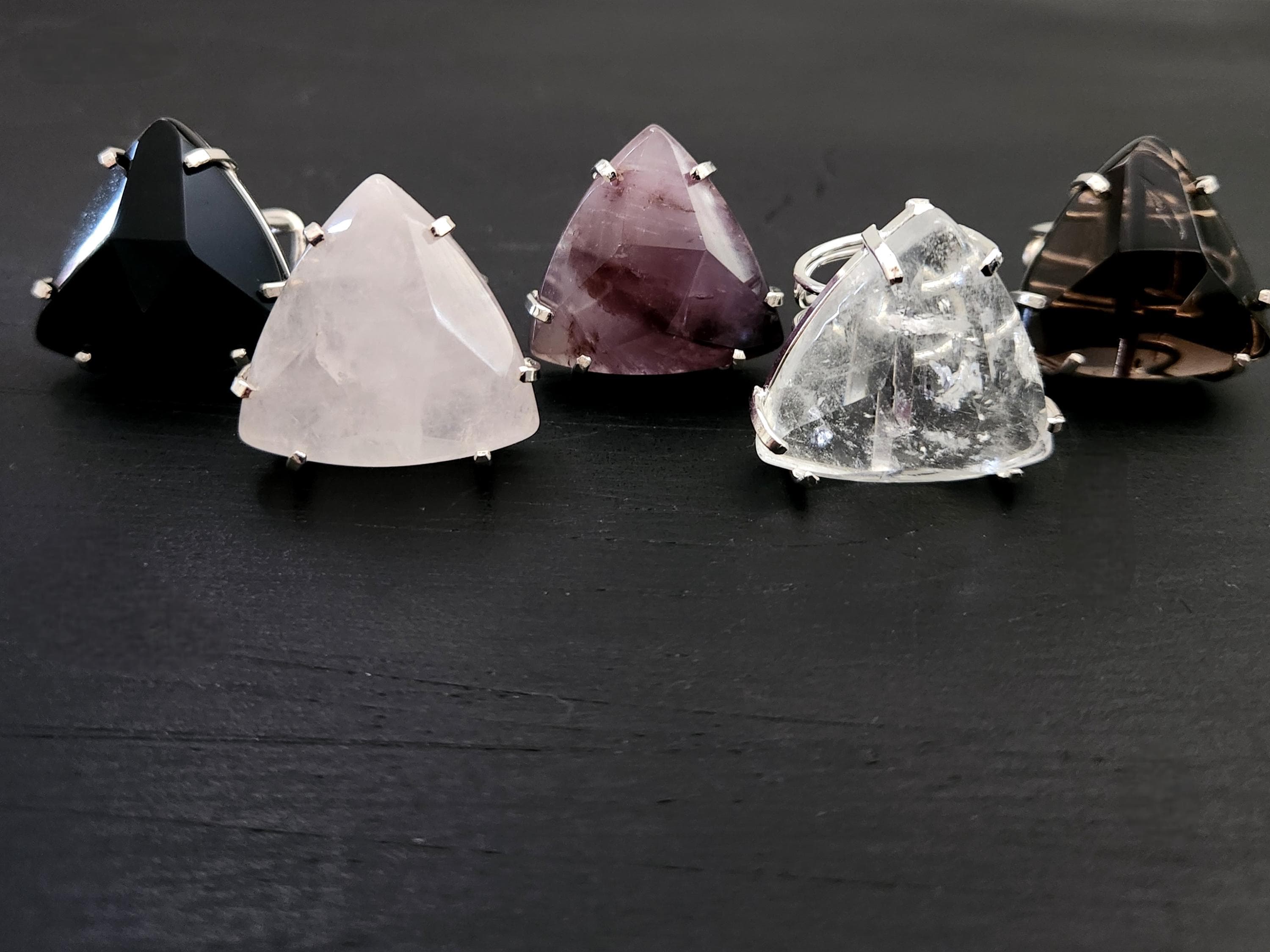 -Available in silver edged faceted trillion shape Clear Quartz, Rose Quartz, Amethyst, Onyx, Smokey Quartz